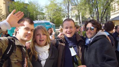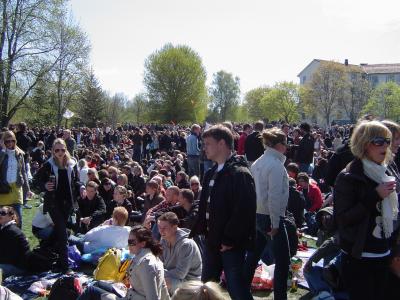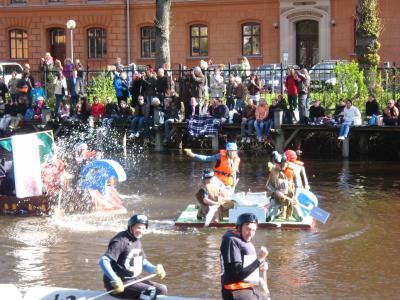 Am 30 April machen die Schweden mal Schluß mit der Reserviertheit und höflichen Zurückhaltung. Naja, zumindest die Studenten. Man setzt sich in den Zug und fährt nach Uppsala, DER Studentenstadt überhaupt in Schweden. Dort angekommen, beginnman den frühen Morgen (hatte ich erwähnt, dass es 8 Uhr ist?) mit Erdbeeren und Sekt. Man pflanzt sich auf irgendeine Wiese und legt los. Zwischendurch kann man dann noch dabei zusehen, wie sich studentische Gruppen in selbstgebastelten Booten darum prügeln, als erste das Ziel der Flußtour zu erreichen.